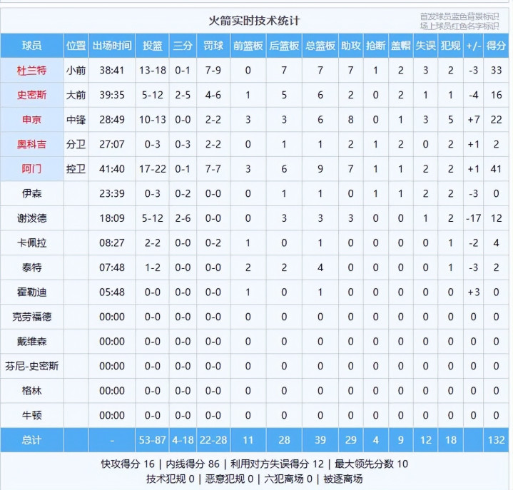 数据:阿门41分9板7助、杜兰特33分7板7助2帽、申京22分6板8助、史密斯16分6板2助2帽、谢泼德12分3板3助、卡佩拉4分1板、泰特2分4板、奥科吉2分2助2帽、伊森1板;香农23分、爱德华兹22分2板3助、迪文岑佐18分4板2助2帽、李凯尔17分6板9助2断、麦克丹尼尔斯16分8板2助4帽、道苏姆15分4助、贝兰热14分4板1助2断、康利9分4助。