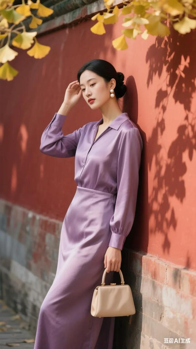 ✔️天秤座:紫色真丝衬衫裙+裸色尖头鞋+珍珠耳环
