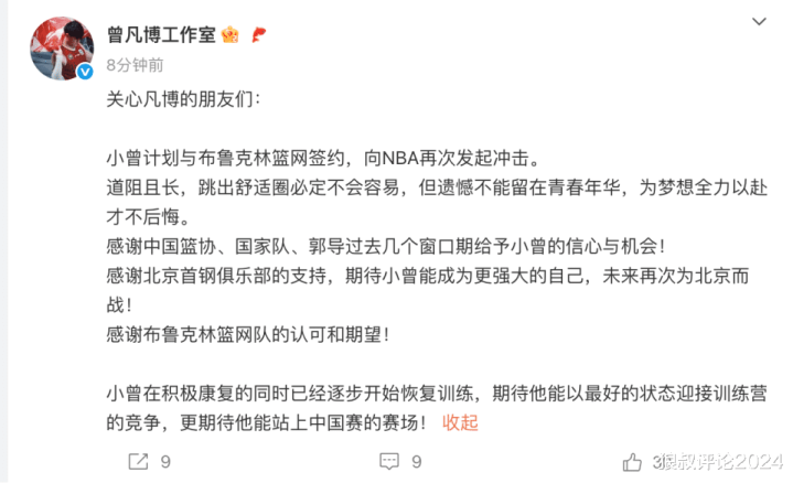 曾凡博在上个赛季的季后赛期间接受媒体采访表示:自己仍有追逐NBA的梦想,只是腰伤复发导致很多计划改变了,包括出战亚洲杯。