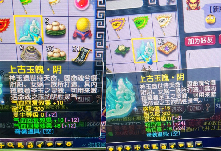 上面这位玩家展示的是自己在铸魂任务中跑出来的上古玉魄,上面这位玩家跑出来了两个三同属性的上古玉魄,但是这两个上古玉魄都不值钱,原因是上面这两个上古玉魄的属性是气血回复效果和格挡值,都是梦幻西游中最不值钱的属性,像上面的这种装备好像只能给五庄观等平民玩家来使用了。上面的这种装备带了以后在任务系统中的使用效果还是比较好的,但是却入不了那些大佬的眼,所以就很难卖到高价。