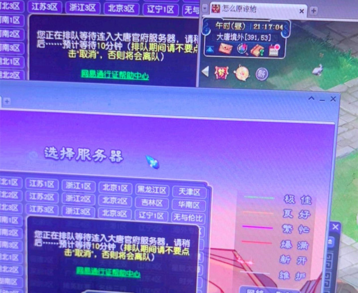 上面这位玩家的5个角色中有两个掉线了,想要将这两个角色再登上来需要上面这位玩家等10多分钟的时间,角色上线以后身上的临时符都已经掉线了,而剩下的那三个角色也不能下线。又被白白浪费了10分钟的点卡,所以小编建议各位玩家玩5开的时候去那些人稍微少一点的服务器,区里人多,但是活动的时候不排队的服务器。