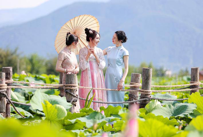永胜县三川镇万亩荷花进入盛花期,吸引众多游客前来观赏。记者胡妤雅摄