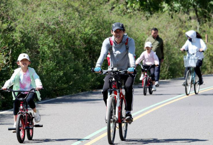 市民游客在滇池绿道骑行健身。记者杨峥摄