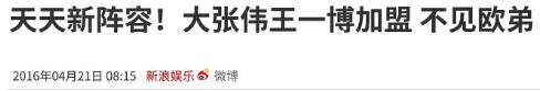 新浪娱乐——2016年4月21日——天天新阵容!大张伟王一博加盟 不见欧弟