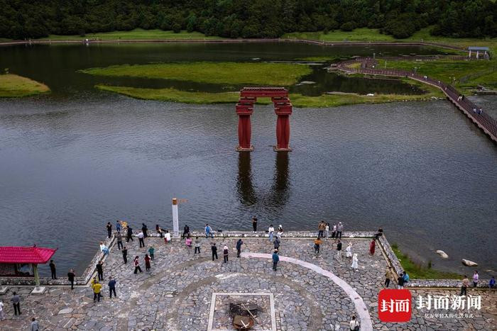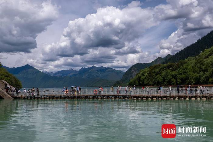 西藏林芝市巴松措景区,水天一色的风光吸引了众多游客。