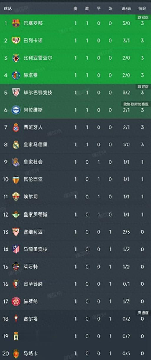 北京时间8月20日,随着皇马1-0小胜奥萨苏纳,西甲第一轮的比赛全部结束,我们一起看看最新的积分榜变动,一共有8支球队取得了开门红,2场比赛出现平局!