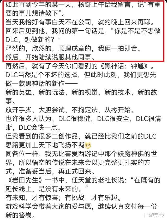 这俩人想到一块去了,相较于黑神话DLC,他们想做新的东西,想做一个更完美的新游戏,为了回馈玩家,为了给玩家一份新的答卷。也就是说他们不打算拿黑神话DLC来圈钱,而是希望随后以更扎实、更完整、更完美的《黑神话:悟空》方式回归。说真的,“游戏科学”团队有冯骥、杨奇,幸甚!也真的很让人为之感动。