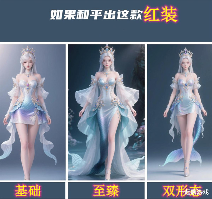 而玩家拿出“手稿”的设计,根据红装外观基础、至臻、双形态来划分,主题采用的是“深海美人鱼”,版型设定以及细节方面也算是中规中矩。