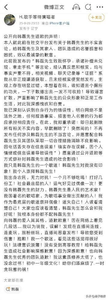 28日深夜,微博用户@HL歌手等待演唱者公开向韩磊致歉,称此前发布的韩磊先生致其怀孕、承诺补偿未兑现、拿走手机等言论,经认真反思和核实,均与事实严重不符。相关视频、聊天记录等“证据”系从非正规渠道获取,“本想着在玩,谁知道去个厕所的功夫,一下子散播出去,一发不可收拾!”对此道歉长文,评论区中不少网友表示不接受,“这道歉声明?完全梦到哪句写哪句。”