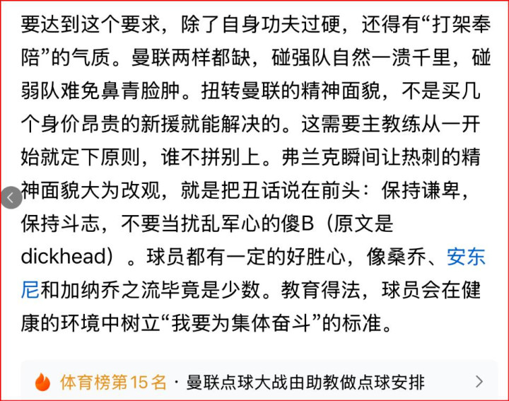 引援的时候,曼联的引援部门怂;队内管理的时候,曼联对刺头怂;面对强悍的对手,曼联球员怂,曼联从上到下都很怂,这就是曼联无数次重建的根源,你没有坚持到底的勇气。