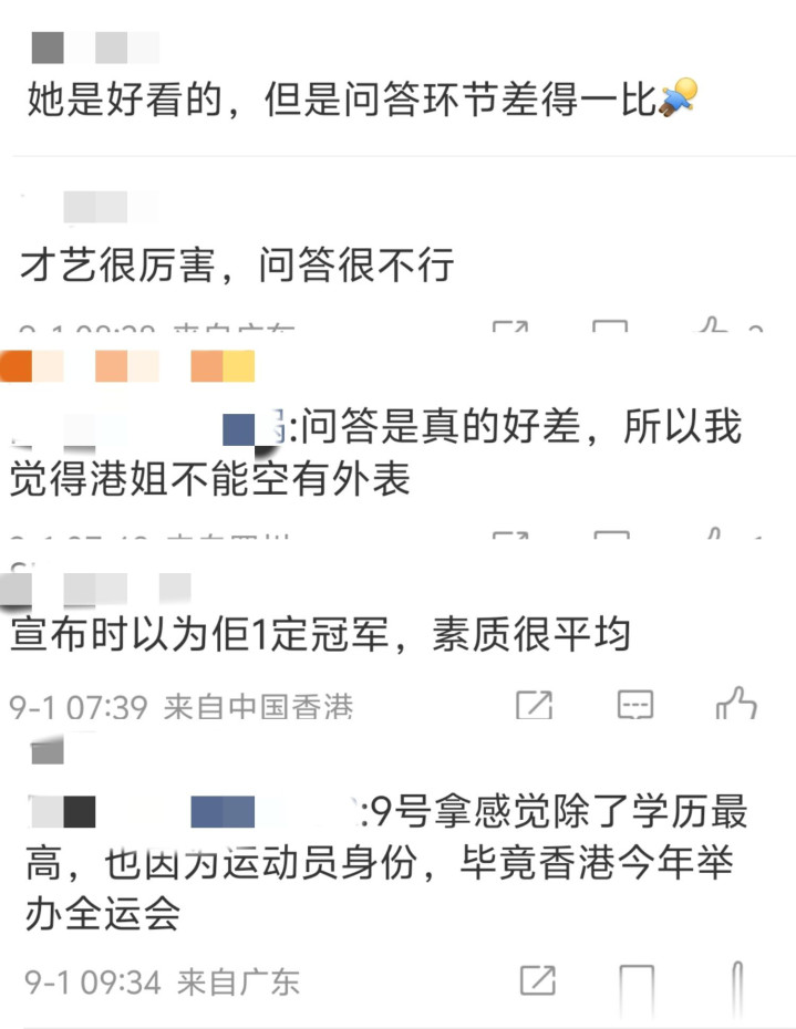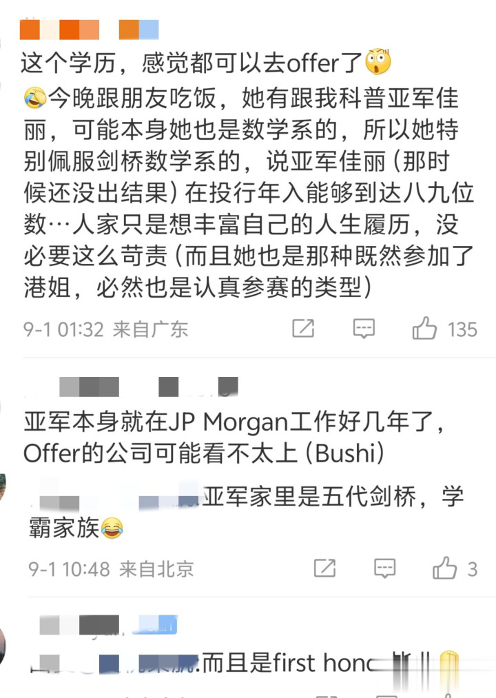 这一届学历普遍很高,亚军施宇琪中英混血,毕业于剑桥大学,金融硕士,早就入职香港投行公司,据说家里五代剑桥,她本人在互联网名为“卢安琪”的账号有十几万粉丝。
