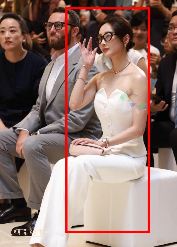 穿着裹胸的白色套装,肤白貌美、皮肤又亮又惹眼。