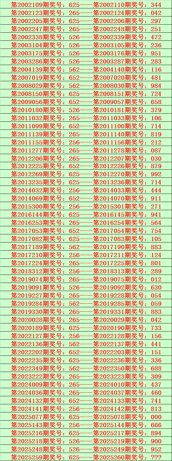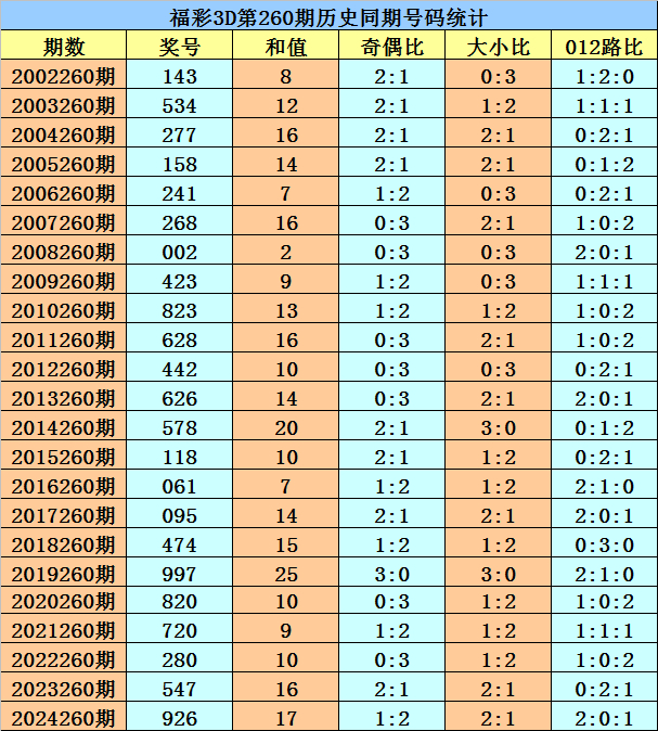 福彩3D第2025260期开奖日期:2025年9月27日,历史上第260期已开出了23次奖号,历年同期号码分别为:143、534、277、158、241、268、002、423、823、628、442、626、578、118、061、095、474、997、820、720、280、547、926。
