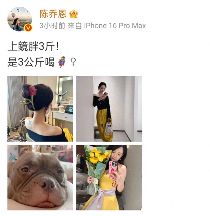 8月11日,陈乔恩发文晒照,称:“上镜胖3斤!是3公斤喝。”46岁陈乔恩穿着紧身上衣,一点都不胖,抹胸上衣露出了肩膀上的纹身。