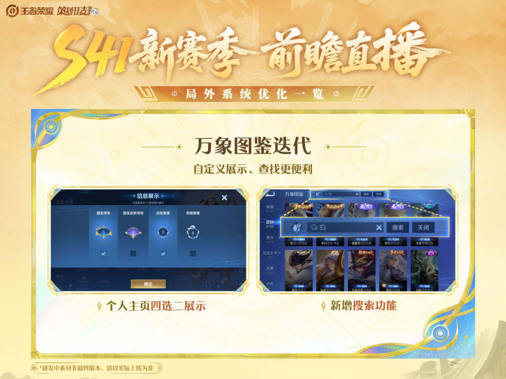 此外新赛季的图鉴也同样有所改动,如上图所示,新赛季的个人主页可以四选二展示,图鉴则是增加了搜索功能。