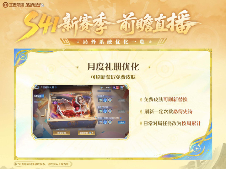 在新赛季,福利礼册也会迎来优化,首先是获取的免费皮肤,可以刷新替换,并且刷新一定的次数之后,就会必得一款史诗皮肤。