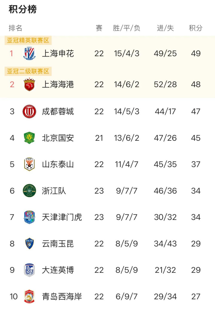 本轮结束后(北京国安还没有比赛),申花凭借3分重返榜首,49分的积分优势不大!领先第2名的海港1分、领先成都2分。如果北京国安本轮获胜,那么争冠形势依然胶着!