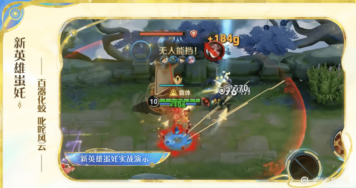 一技能是向前方冲锋,二技能则对前方范围造成伤害,大招开启后,蚩奼会使用五种兵器作战,普攻变为移动施法,自身移速和攻速也大幅提升。