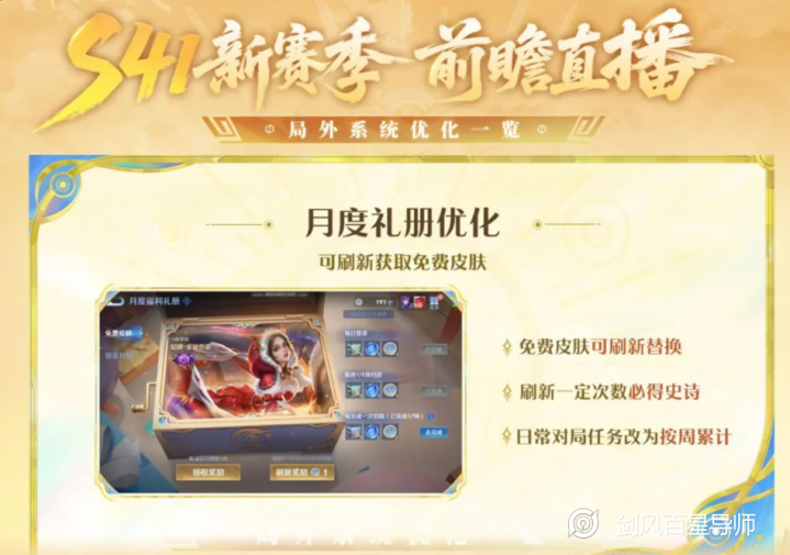 月度礼册也有了多处优化。首先,免费皮肤的获取方式变了,后续可以通过刷新来替换。其次,当刷新次数达到一定数量后,必定能获得史诗皮肤。