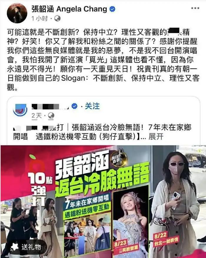 这些报道让张韶涵感到非常不满,她直接在社交媒体上发文硬刚,怒斥这些无良媒体是“见不得光”的存在,并且明确表示正是因为这种扭曲的媒体环境,她才不愿意回台湾举办演唱会。