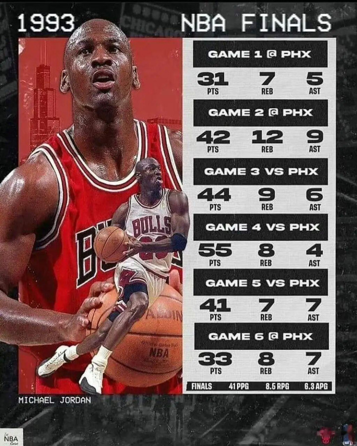 没错!乔丹虽然参加了6次总决赛,并且在1993年总决赛场均砍下41分,但是6次总决赛也只有6次得到40+。