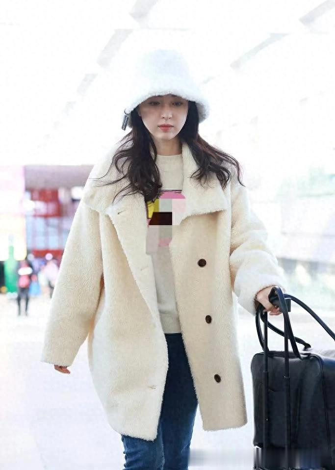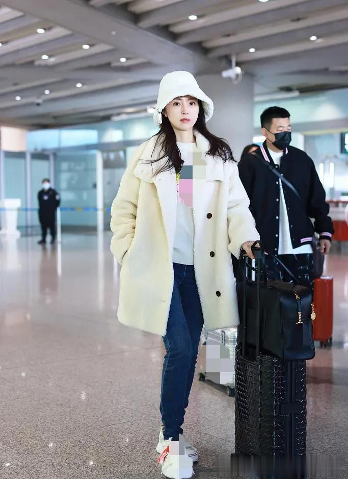 董璇机场私服真会穿! 毛绒大衣+牛仔裤+渔夫帽, 时髦减龄又高级!
