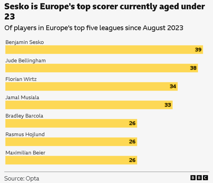 在进球数方面,2022年夏季转会到莱比锡之后,他在87场比赛打入39球,外加8次助攻。其中,德甲64场打入27球,有6球在欧冠取得。这让他成为欧洲五大联赛23岁以下球员中的头号射手,比皇家马德里的贝林厄姆多1球,比刚加盟利物浦的1亿英镑先生维尔茨多5球。