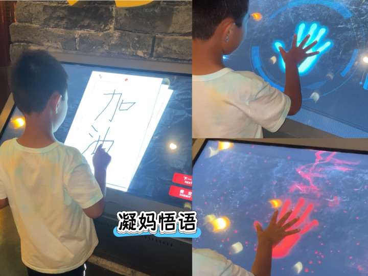 孩子在一个电子屏上写下想说的话,点提交,出来一个蓝色的手掌印。小手按上去,红色的光芒升腾起来,幻化成一个红色的小手掌,仿佛把心意融进历史的洪流中。