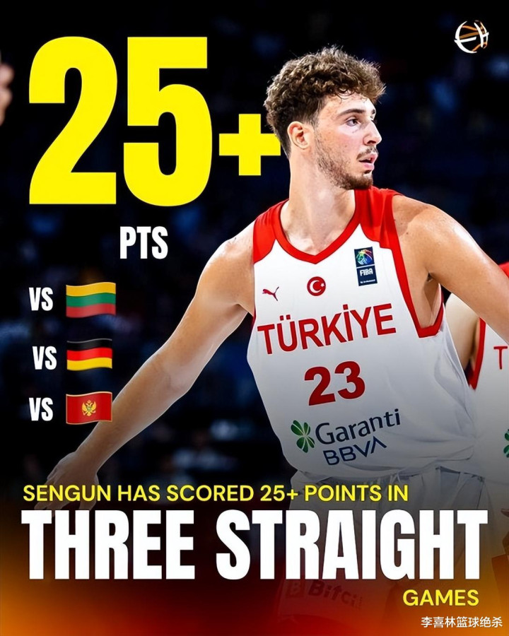 如今土耳其男篮的领袖是火箭首发中锋申京。他参加的过去3场热身赛都砍下25+。作为土耳其男篮的内线支柱,申京在击败黑山男篮一战统治了内线,完爆了NBA全明星中锋、黑山男篮核心武切维奇,后者只得到9分1篮板4助攻。
