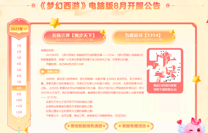 不知道各位玩家有没有注意到梦幻西游时间服务器在8月份开启的第2个服务器,在八月分开启的第2个服务器是一个纯数字的服务器,名字为1314,看名字就知道这是一个七夕情人节的限定服务器。在梦幻西游中任何一个全数字的服务器都会火一段时间,所以1314服务器是冲新区的玩家的比较优的选择。如果各位玩家自己想玩进去,小编建议各位玩家不要错过这次机会,错过了这次机会,想要再在时间服务器内进入纯数字的服务器可能需要等好几年。
