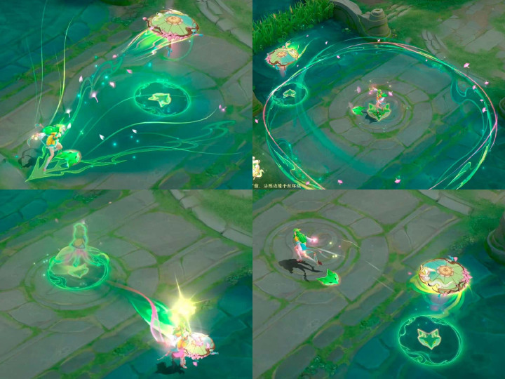然后再来看一下这款皮肤的技能特效,整体的特效是以绿色为主,看上去还是比较简洁的,并没有花里胡哨的内容。