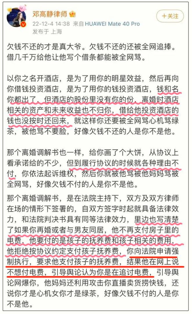 更意想不到的是,一边是她生前的委托律师邓高静怒怼谣言,誓要为她“讨个清白”,另一边却是汪小菲团队晒出法院判决书,质疑她“没有委托权”。