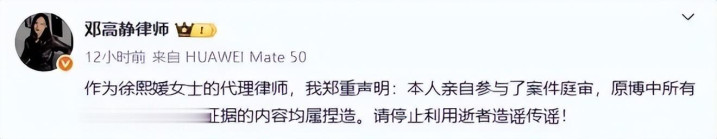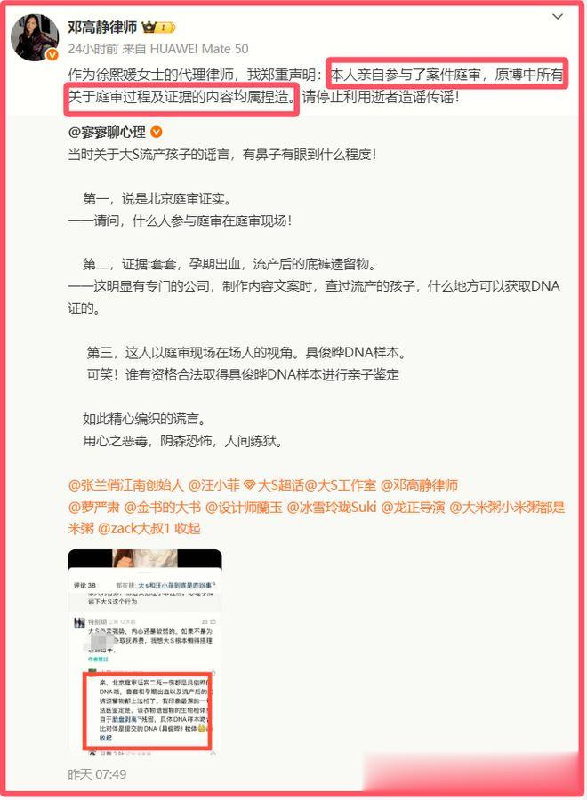 很快,大S的代理律师邓高静站出来,直接发声:“本人参加了庭审,原帖内容全部捏造。”