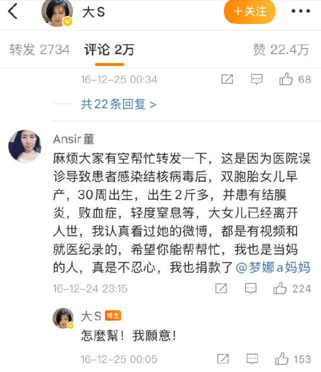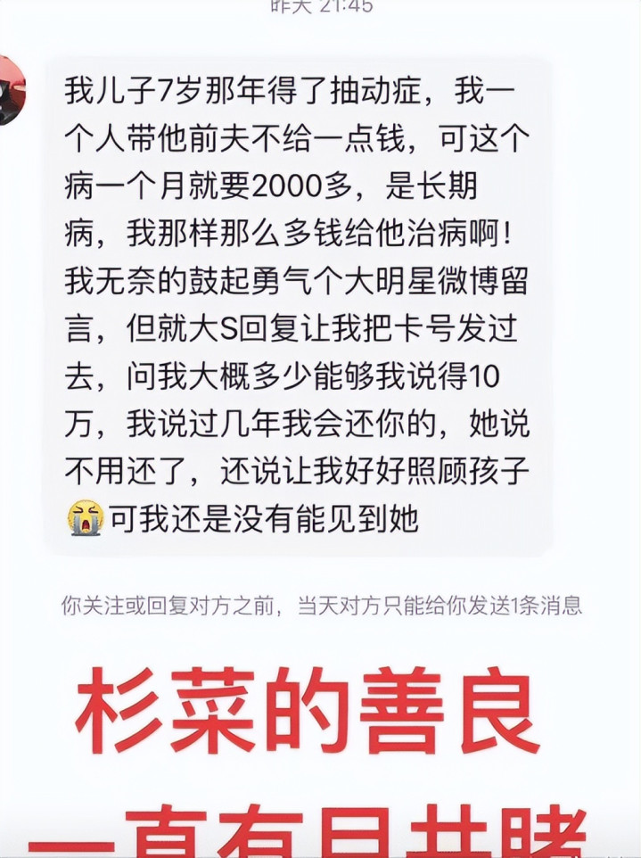 像那次,有个母亲留言说孩子得了病,前夫不管,她实在没钱。大S默默转了十万,说:“不用还,好好照顾孩子。”