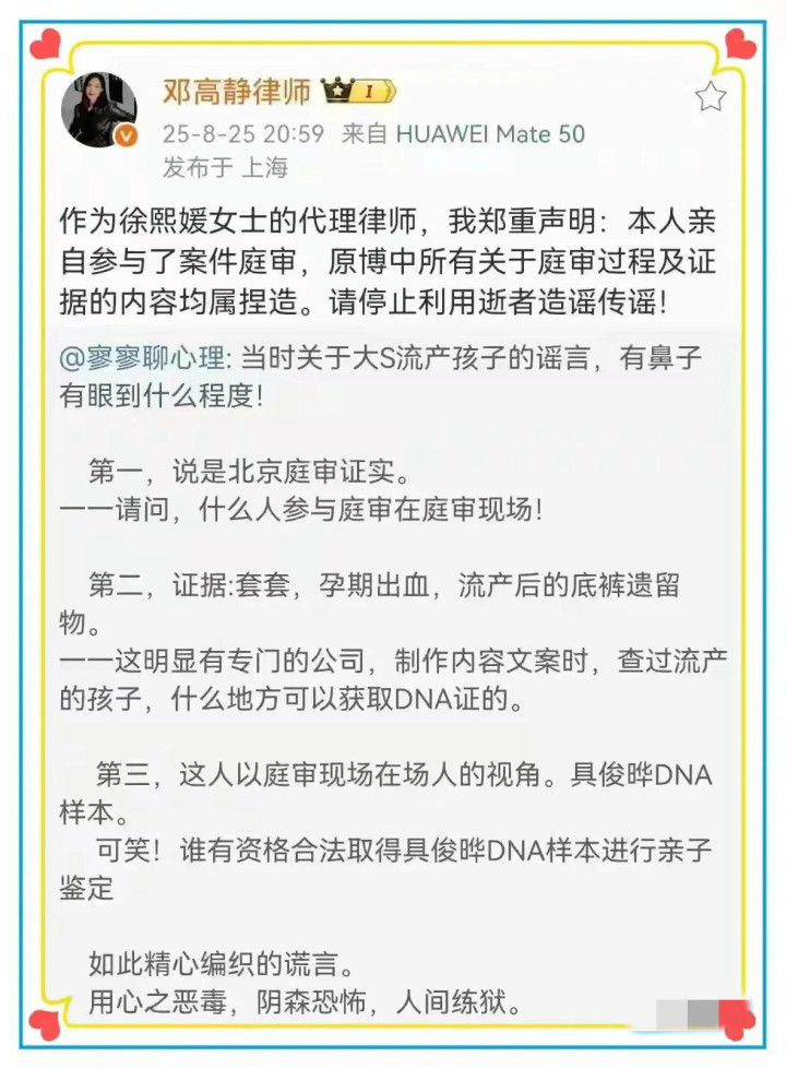 8月25日,邓高静律师郑重声明:关于大S流产的孩子,存在具俊晔的DNA样本一事,进行怒斥。本人亲自参与案件庭审,全部是造谣,请停止用逝者传谣。