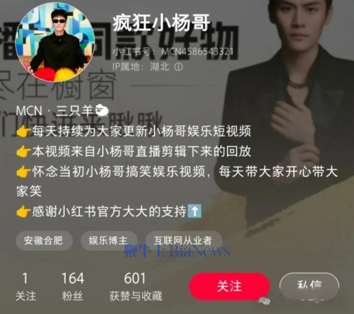 值得注意的是,该账号主页虽标注“MCN·三只羊”,但账号定位是“娱乐博主”、“互联网从业者”,标签写着“安徽合肥”,IP属地是湖北,其真实身份仍待考证。