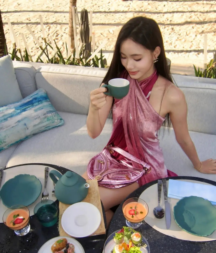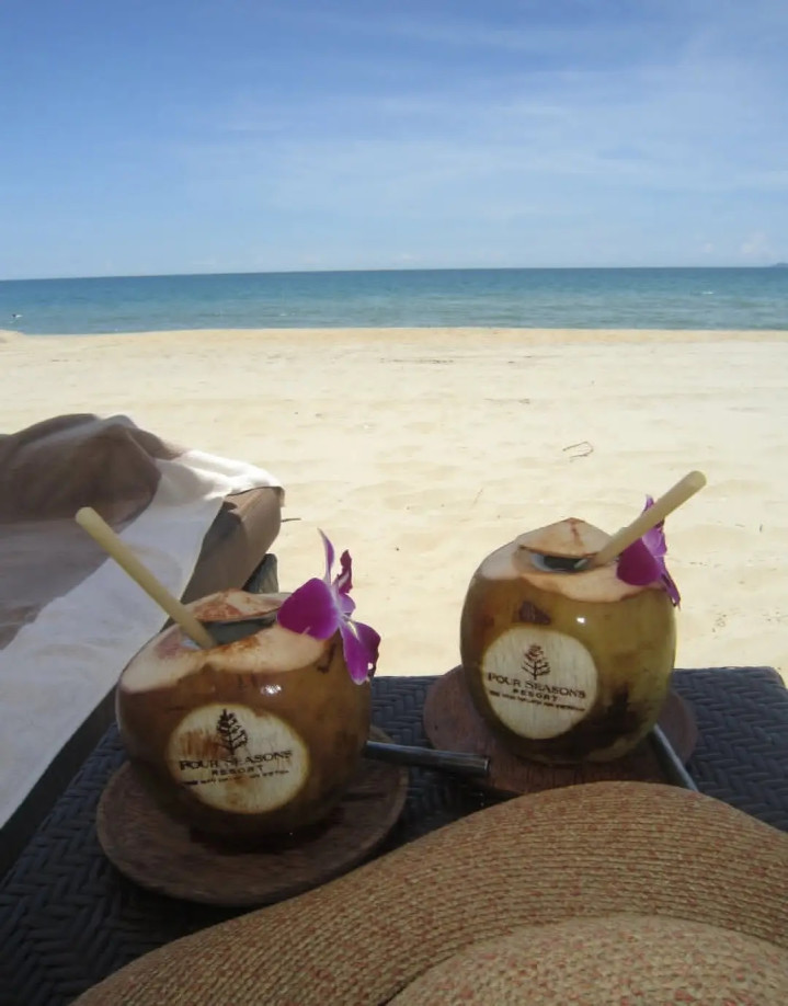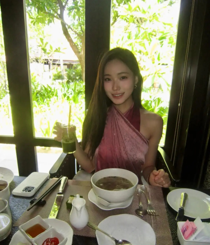 照片里,床是双人的,餐具是两套的,椰子是两个的——最要命的是,她没晒一个人影。