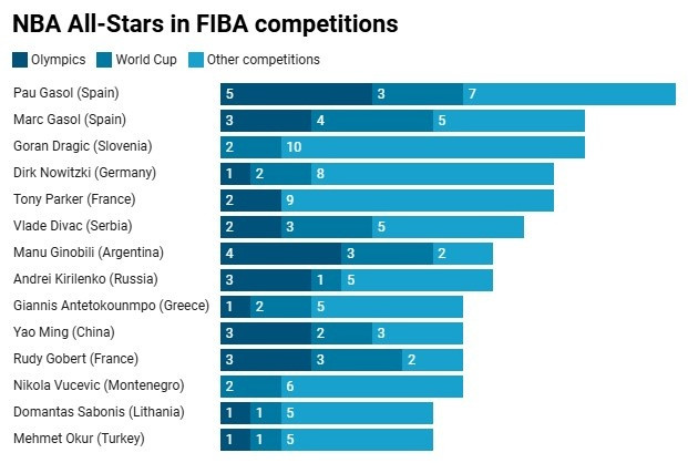 直播吧9月3日讯2025男篮欧锦赛正在进行中,今天,美媒HoopsHype统计了为国家队出战大赛次数最多的一些NBA球星,保罗-加索尔15次居首,姚明8次并列第9。