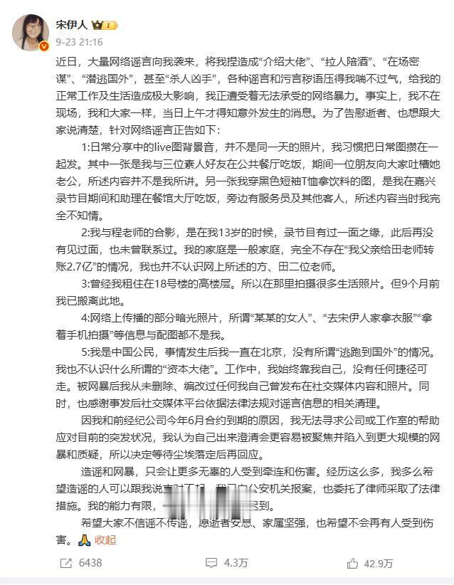 本文信源来自权威报道:【九派新闻、宋伊人个人微博、凤凰网】等(详细信源附在文章末尾)。为提升文章可读性,细节可能存在润色,请理智阅读,仅供参考!