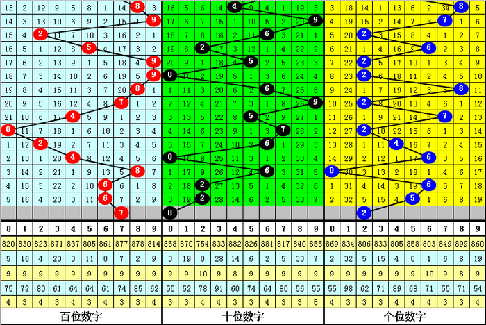 跨度、和值分析:近期跨度主要分布在2-9区域,比较分散,本期预计跨度上升,参考跨度7。和值近期波动范围较大,上期开出和值13,本期预计和值下降,参考和值9。