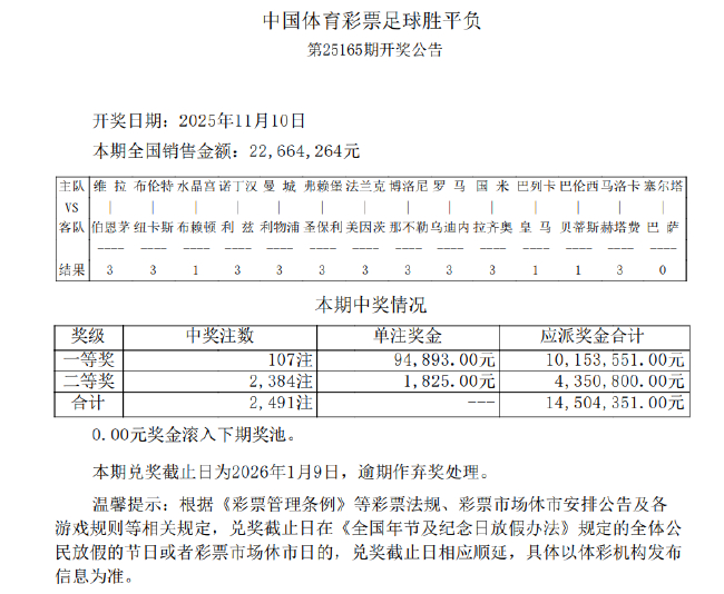 北京时间11月10日,足彩第25165期开奖结果揭晓。14场1等开出107注,单注奖金94893元。14场2等开出2384注,单注奖金1825元。任九开出15932注,单注奖金845元。本期14场销量为22,664,264元,任九投注总额为21,038,530元。