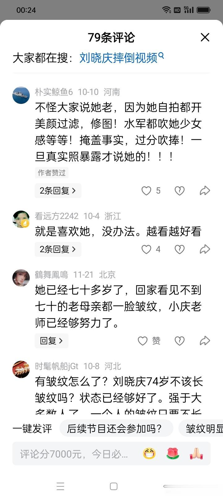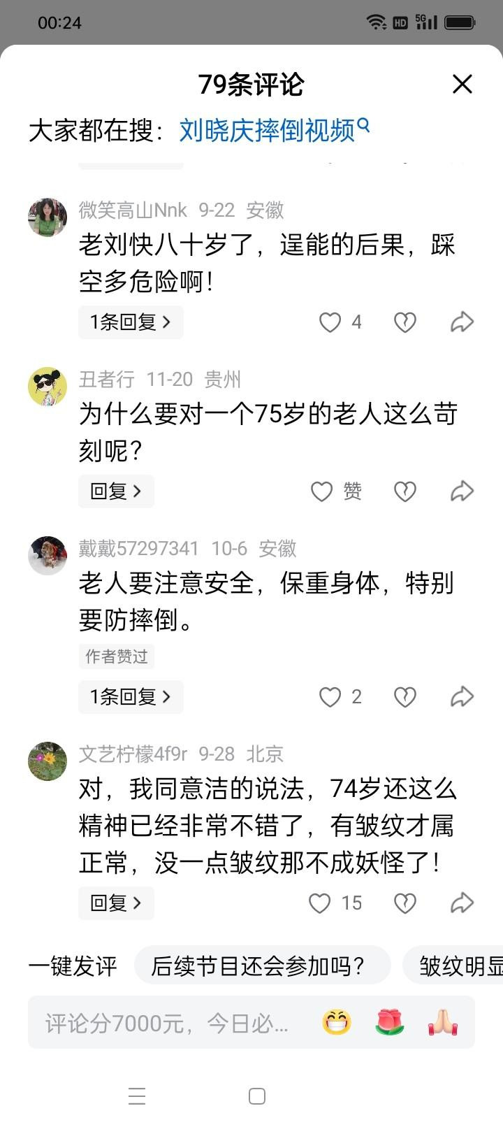 刘晓庆的摔伤事件引发网友两极反应。一部分人对她“75岁仍如此拼命”的精神表示敬佩,认为她是“娱乐圈的楷模”“活到老拼到老”;另一部分人则担忧她的身体状况,呼吁她“工作再重要也没健康重要”“该休息时就休息”。这种矛盾心态,恰恰反映了公众对老艺术家的复杂情感:既希望他们继续发光发热,又心疼他们承受的辛苦。